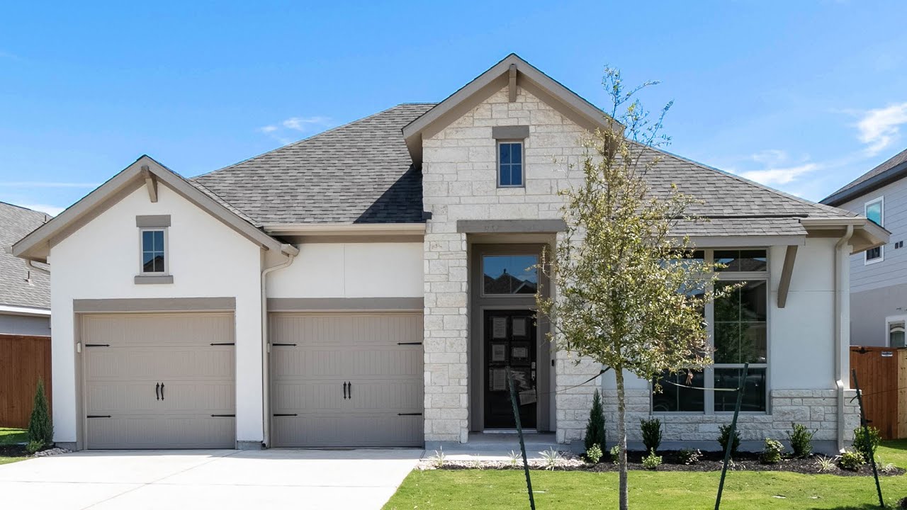 Located in Liberty Hill, Santa Rita Ranch is a master-planned community with new homes for sale near Georgetown, Texas. This 2545 sq. ft. home offers four bedrooms and three full bathrooms. Extended entry with 13-foot ceiling leads to open kitchen, dining area and family room. Kitchen features generous counter space, corner walk-in pantry and inviting island with built-in seating space. Family room features wall of windows. Game room with French doors across from kitchen. Master suite includes double-door entry to master bath with dual vanities, garden tub, separate glass-enclosed shower and two walk-in closets. All bedrooms feature walk-in closets. Covered backyard patio. Mud room off two-car garage. #perryhomes #perryhomesaustin