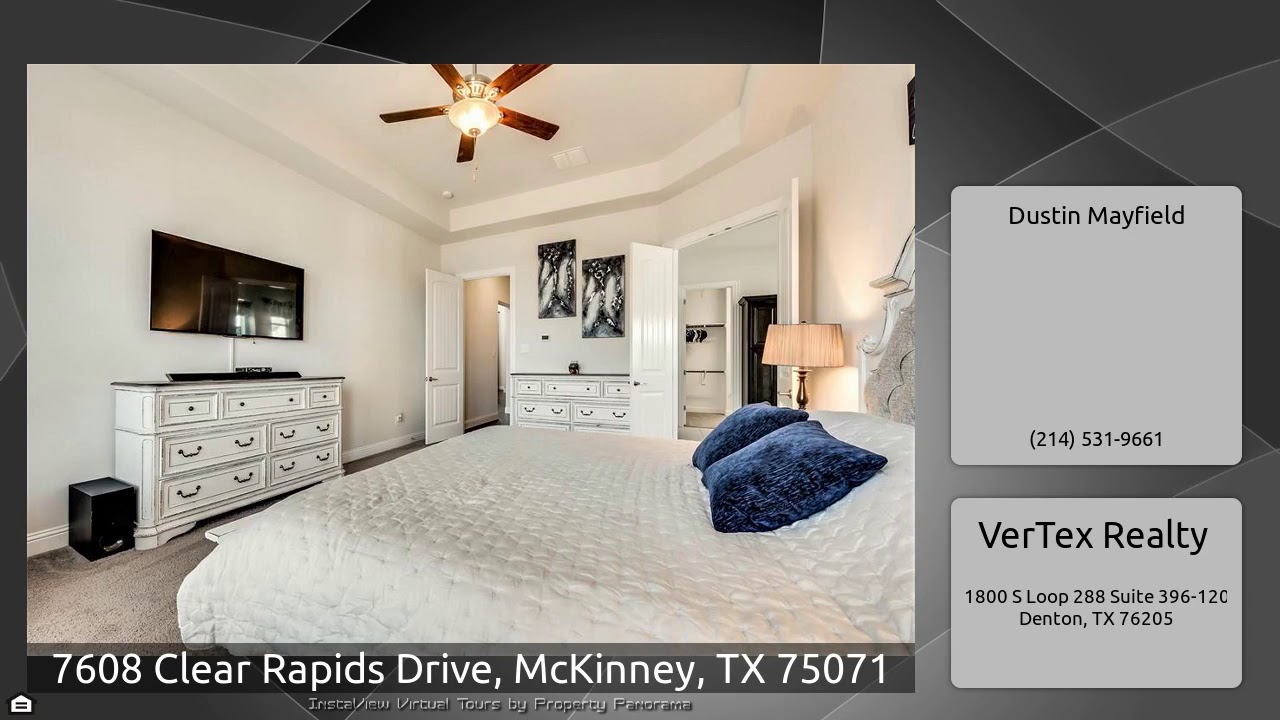 The Virtual Tour for the property at 7608 Clear Rapids Drive, McKinney, TX 75071 listed for $499,900: Other homes for sale by Dustin Mayfield of VerTex Realty: Gorgeous Gehan Oriole open floorplan features rich hardwood floors, a gourmet island kitchen boasting granite, 5 burner gas cooktop, stainless steel appliances, butlers pantry and breakfast nook, with the formal dining, family room with gas fireplace, media room, executive study with french doors, mud room, large utility with room for a freezer, and the HUGE master suite with his and hers walk-in closets, enormous walk-in shower, …