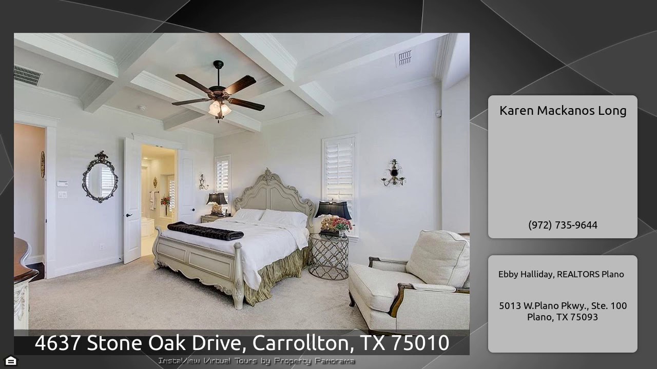The Virtual Tour for the property at 4637 Stone Oak Drive, Carrollton, TX 75010 listed for $589,997: Other homes for sale by Karen Mackanos Long of Ebby Halliday, REALTORS Plano: Exquisite home in pristine condition. Fully upgraded with beautiful Wd flooring, granites, marbles, millwork, lighting, custom wrought iron stairs, extended back patio.Oversized Study boasts 2 sets of French doors. Fml Dining is accented w upgraded chandelier & wall sconces. Kitch has over sized island that allows up to 5 barstools,above & below cabinet lighting,pull out spice racks,glass cabinet doors,WI pantry,5 …