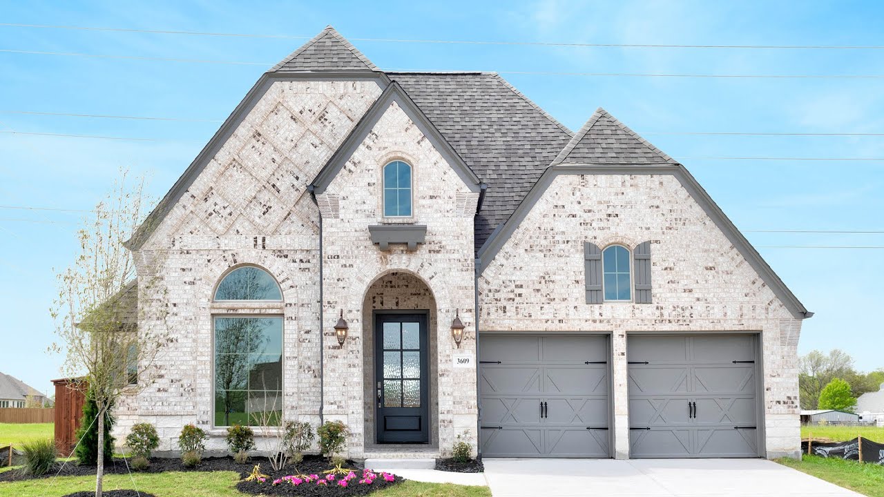 Prairie Oaks is a new master-planned community located in the lakeside town of Little Elm, Texas. This 2586 sq. ft. ready for move in home has four bedrooms, three full bathrooms and one half bathroom. Library with French doors off coffered extended entry. Kitchen and dining area open to family room with wood-look ceramic tile floor, wall of windows and fireplace. Kitchen features inviting island with built-in seating space. Spacious master suite. Double doors lead to master bath with dual vanities, garden tub, separate glass-enclosed shower and two walk-in closets. Guest suite. Walk-in closets in all bedrooms. Covered backyard patio. Mud room off two-car garage. #perryhomesdallas #perryhomes