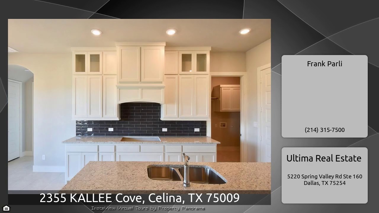 The Virtual Tour for the property at 2355 KALLEE Cove, Celina, TX 75009 listed for $459,000: Other homes for sale by Frank Parli of Ultima Real Estate: $30K PRICE DROP!Brand New ONE STORY on 1 acre in Celina! No city taxes! Beautiful brick and stone combination. Fantastic layout features HUGE Formal Dining with Panned ceiling, large Study with French Doors, HUGE Family Room with 12' ceiling, 20' x 14' Master Bedroom with 12' ceiling and HUGE closet, great Kitchen with Custom Cabinets and granite tops, 3 large bedrooms, and HUGE 18' x 18' Game Room! Hardwood floors in Entry, Study, F. …
