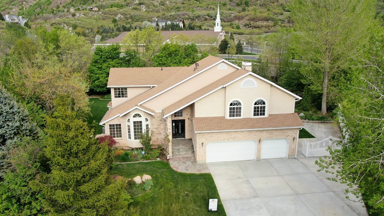 Elegant home with vaulted ceilings, and large living spaces tucked in the back of a circle. Wooded lot walking distance to park. Lovely Back yard used for family weddings complete with water fountain. Walk over bridge to the gazebo and enjoy a cozy fire with in-ground fire pit. In ground trampoline sport court with basket ball standard. Back yard lighting. Large elegant hard wood entry with spacious living room and formal dining. Granite counter tops accent the island kitchen with a large dining nook. Walk out from kitchen to covered deck. Large vaulted Family room with gas fireplace and bookshelf’s. French doors open on to backyard patio. Upper floor has huge master suite with jetted tub and separate shower updated with granite counter tops. Balcony over look to backyard and gorgeous mountain views! Three bedrooms and full bath in addition to Master up. Lower level has one large guest bedroom, den or entertainment room, full bath with steam shower, second family room with fireplace and wet bar. Lots of storage too!