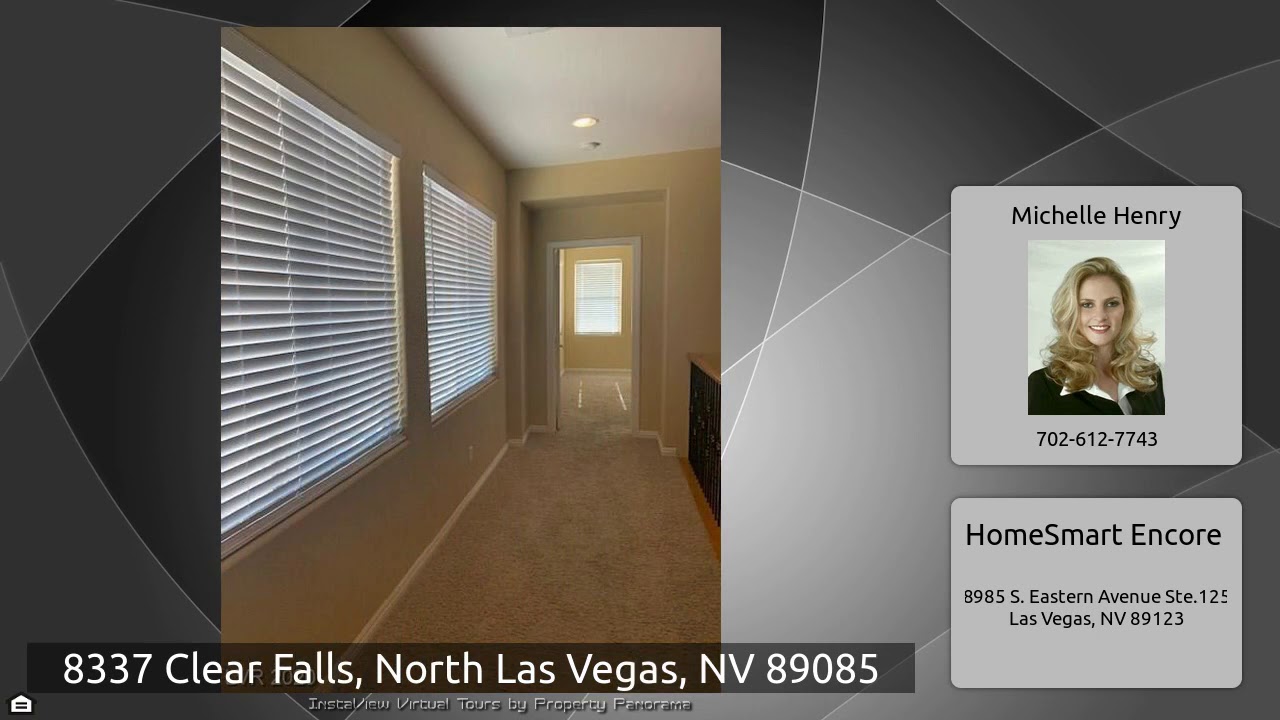 The Virtual Tour for the property at 8337 Clear Falls, North Las Vegas, NV 89085 listed for $389,000: Other homes for sale by Michelle Henry of HomeSmart Encore: Great floorplan in gated community! Large kitchen with granite island, lots of cabinet space opens to family room with fireplace. Separate family room and dining area with french doors that open to pavered patio. Master bedroom separate from other rooms. Large backyard and all appliances. Community pool and clubhouse, exercise room and parks!