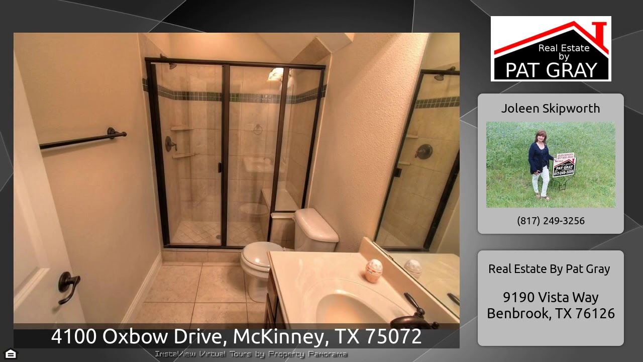 The Virtual Tour for the property at 4100 Oxbow Drive, McKinney, TX 75072 listed for $449,900: Other homes for sale by Joleen Skipworth of Real Estate By Pat Gray: Gorgeous & spacious home w dramatic entry, NAIL-DOWN HAND-SCRAPED HARDWOOD floors & curved WROUGHT IRON staircase w Scarlett O'Hara balcony! Hard-to-find EXTRA BEDROOM W FULL BATH DOWNSTAIRS. Private OFFICE with French doors & Formal Dining also feature hand-scraped hardwoods. Family Room with soaring ceiling & beautiful STONE FIREPLACE is open to the breakfast bar on the island and the huge chef’s WHITE KITCHEN with granite, …