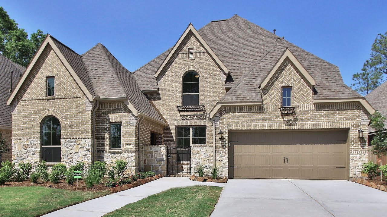 Explore new homes for sale in a Humble, Texas in The Groves. This two-story 3496 sq. ft. plan offers five bedrooms, five full bathrooms and one half bathroom. Front courtyard with spacious porch welcomes. Library with French doors set at entry. Open kitchen features large walk-in pantry and generous island with built-in seating space. Two-story family room with ceramic tile floor features wall of windows and corner cast stone fireplace. Media room off two-story dining area. Private master suite. Master bath features dual vanities, garden tub, separate glass-enclosed shower and large walk-in closet. First-floor guest suite. Second floor guest suite. Game room, two secondary bedrooms and two full baths complete the second floor. Extended covered backyard patio. Mud room off three-car garage. #perryhomes #perryhomeshouston #thegroves