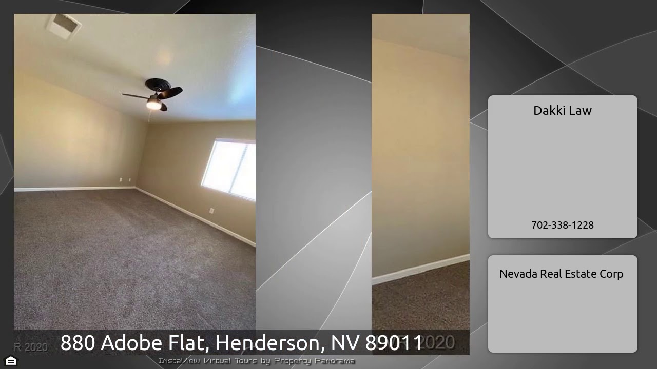 The Virtual Tour for the property at 880 Adobe Flat, Henderson, NV 89011 listed for $1,395: Other homes for sale by Dakki Law of Nevada Real Estate Corp: Single Story Home! Newly renovated & updated. Kitchen-granite countertops, breakfast bar seating, center island with seating & storage. French Doors open to covered patio & private backyard with desert landscape, New drip irrigation, newly finished garage with epoxy flooring. wo tone paint with chair rail in Living and Dining Areas. Master Bedroom has new carpet & large walk in closet. Solar is owned. Newly professionally landscaped front yard.