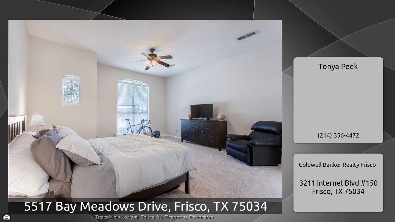 The Virtual Tour for the property at 5517 Bay Meadows Drive, Frisco, TX 75034 listed for $399,000: Other homes for sale by Tonya Peek of Coldwell Banker Realty Frisco: Open & welcoming floor plan perfect for entertaining & enjoying your family in this Highland home. Home features double stack crown molding in entry & dining room, decorative lighting, wood flooring & ceiling fans throughout! Private & large study with French Doors. Spacious family room with fireplace & gas logs. Kitchen has gas cook top & stainless steel appliances, tons of cabinets for storage & coffee bar! Master suite on …