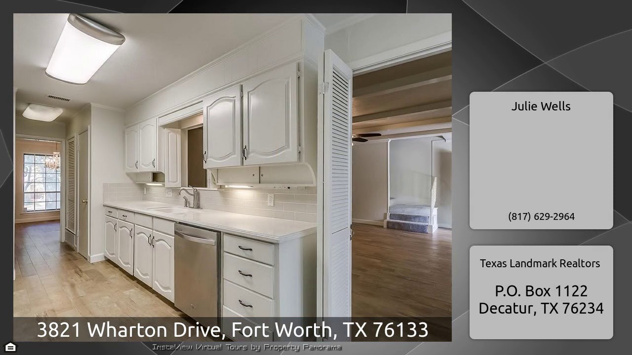 The Virtual Tour for the property at 3821 Wharton Drive, Fort Worth, TX 76133 listed for $285,000: Other homes for sale by Julie Wells of Texas Landmark Realtors: Stately, updated 4 bed 2 bath brick in established Wedgwood neighborhood is perfect to entertain friends & family. New carpet, wood look tile, fresh paint, ready for your final personal touches. Gorgeous leaded glass & wood entry door leads to a roomy living area w beamed ceiling, fireplace & French doors to patio. Two front rooms could be formal dining and office or would make a great home based business space. Lots of kitchen …