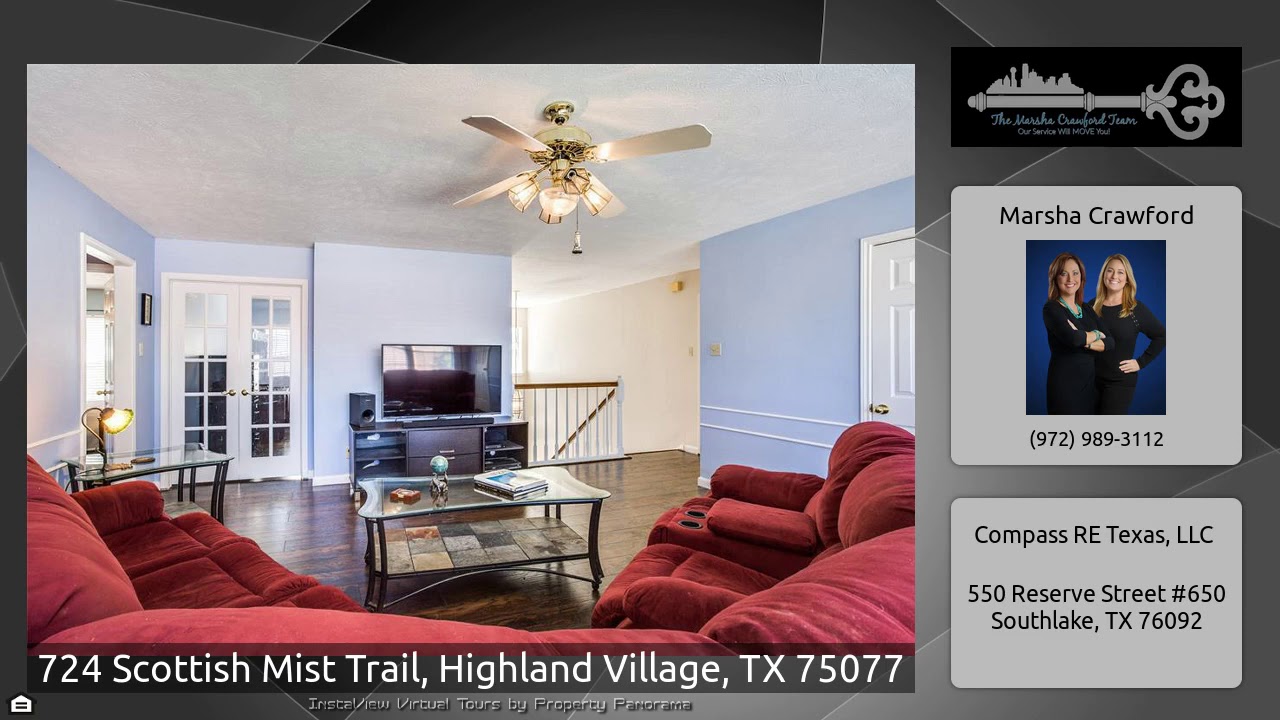 The Virtual Tour for the property at 724 Scottish Mist Trail, Highland Village, TX 75077 listed for $425,000: Other homes for sale by Marsha Crawford of Compass RE Texas, LLC: Fantastic family home located on a large corner lot! The formal dining has space for a large table. There is a FP & generous wall for an entertainment center in the family room. The kitchen features granite counter tops & a bright breakfast area. Master BR down & remodeled master bath. Upstairs is a game room, 3 HUGE bedrooms PLUS a study with French doors! Unbelievable storage & HUGE closets! Retreat to the backyard …
