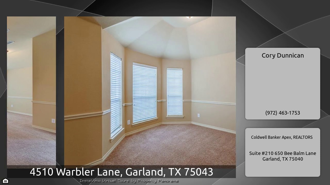 The Virtual Tour for the property at 4510 Warbler Lane, Garland, TX 75043 listed for $365,000: Other homes for sale by Cory Dunnican of Coldwell Banker Apex, REALTORS: The one you've been waiting for! Stunning home inside & out! Gorgeous entry with gleaming hardwoods, a home office with stained French Doors & moldings, a spacious formal dining with extensive moldings opening to butler's pantry & huge walk-in pantry. Family room showcases a stone fireplace, wall mounted flat screen & opens to casual dining area & breakfast bar. Kitchen boasts granite countertops, stainless appliances, & …