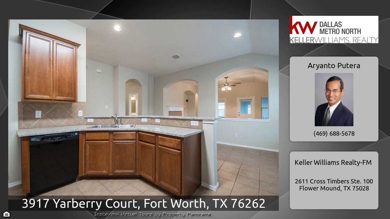 The Virtual Tour for the property at 3917 Yarberry Court, Fort Worth, TX 76262 listed for $275,000: Other homes for sale by Aryanto Putera of Keller Williams Realty-FM: Beautifully kept single story 3 bedroom 2 full bath home located in sought after Chadwick Farms! Arched entryway leads to flowing & open floorplan, featuring many finely apointed amenities including a decorative fireplace, a formal dining with french doors, & separate living room with arched hallways. The bonus room serves as 4th bedroom or home office! HUGE oversized guest bath. His & hers closet in master, sunken tub, & …