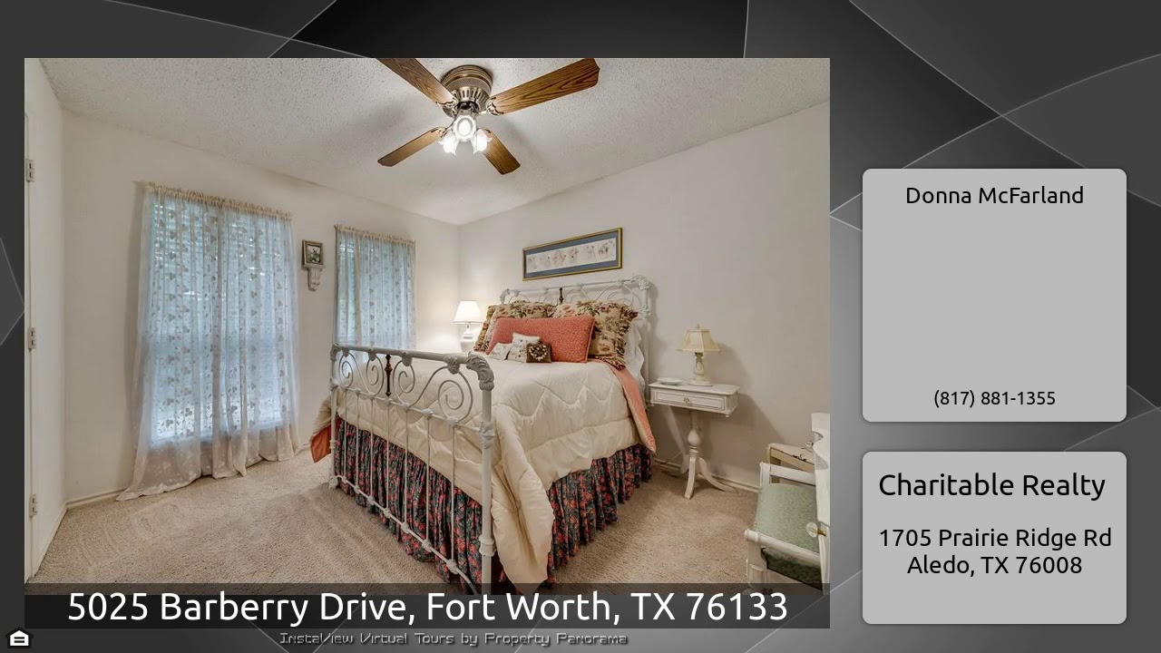 The Virtual Tour for the property at 5025 Barberry Drive, Fort Worth, TX 76133 listed for $279,800: Other homes for sale by Donna McFarland of Charitable Realty: Beautiful 2-story family home with POOL! 3-2.5-2, 2nd living could be office, playroom or 4th bedroom. Living rm with brick wood-burning fireplace, formal dining, French doors to large island kitchen & breakfast. Granite, stainless appliances, walk-in pantry, & separate laundry room. Wood-look porcelain tile thru out entire first floor. Spacious (21×19) master with crown molding; master bath has his-hers walk-in closets, separate …