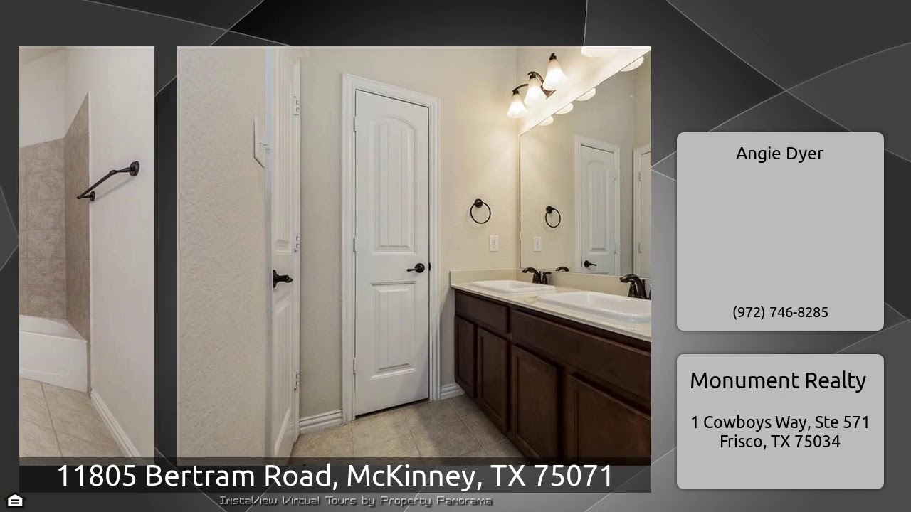 The Virtual Tour for the property at 11805 Bertram Road, McKinney, TX 75071 listed for $310,000: Other homes for sale by Angie Dyer of Monument Realty: Charming 1 story in the sought after community of Prestwyck with Prosper ISD! Brick and stone exterior, 4 bedrooms, 2 baths, executive study with French doors, formal dining and 2 car garage. Many upgrades including ceramic tile, decorative lighting, vaulted ceilings, stone family room fireplace, and plenty of natural light. Kitchen features island, abundance of cabinetry, granite counters, gas cooktop, and breakfast nook. Master suite with …