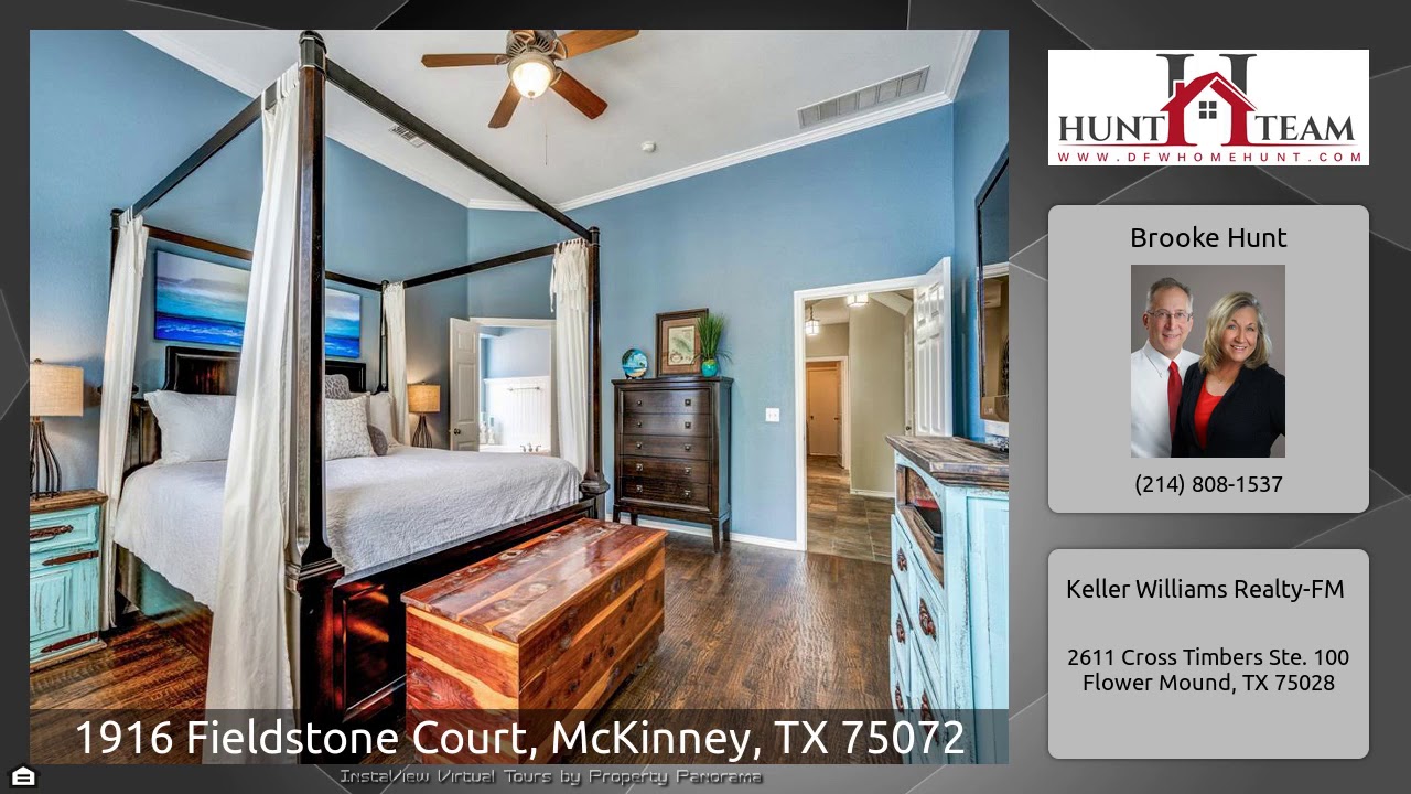 The Virtual Tour for the property at 1916 Fieldstone Court, McKinney, TX 75072 listed for $449,900: Other homes for sale by Brooke Hunt of Keller Williams Realty-FM: Virtual Open House available. Stunning home with no corners cut on detail and design. Most rooms down, only game room or 2nd Master with full bath upstairs, on separate AC zone and leaded glass door to close off if not needed. French doors open to Study across entry from formal dining. Hand scraped hardwoods and slate flooring through out most of downstairs. Granite counters in kitchen with updated black stainless appliances, …