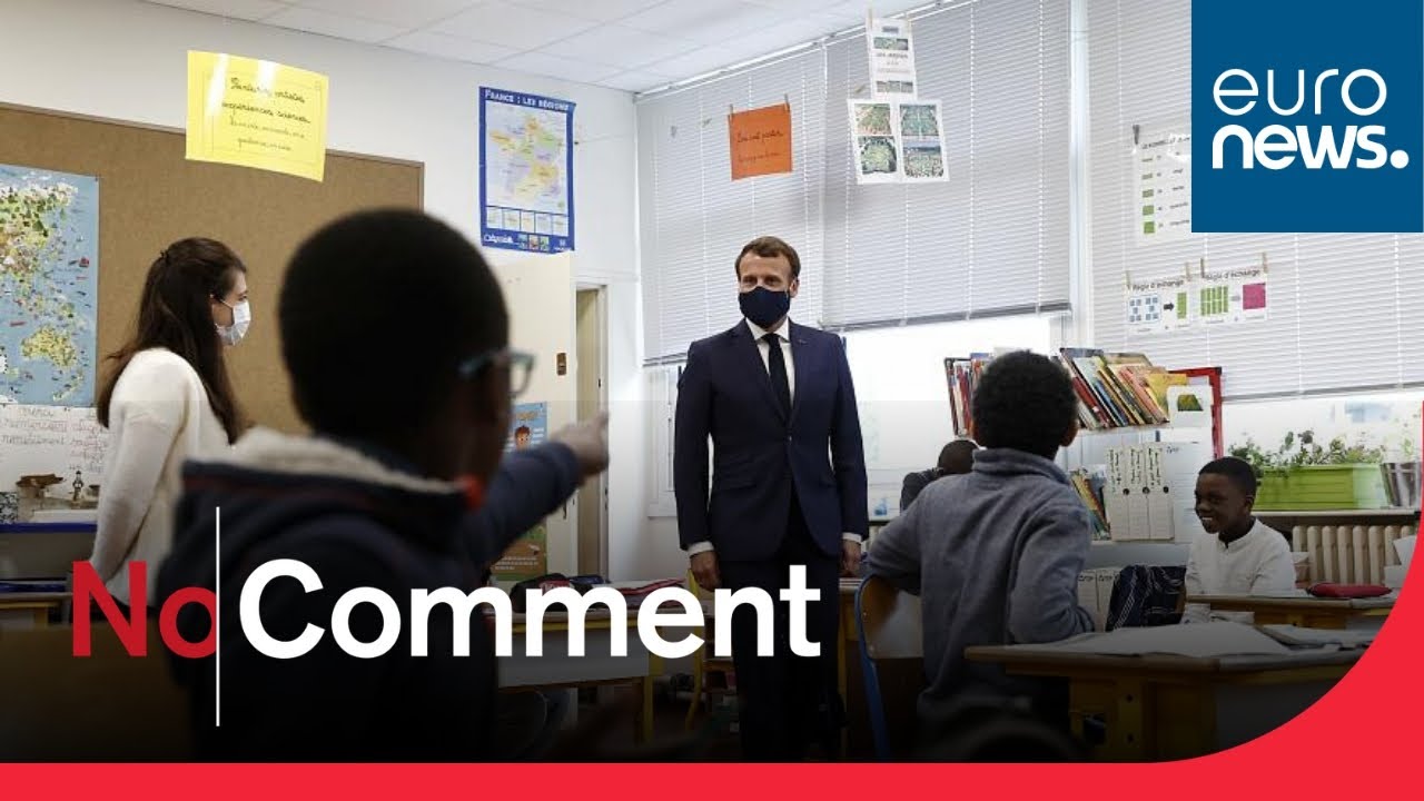 French President Emmanuel Macron, wearing a face mask, visited a school as the country prepares to ease its COVID-19 lockdown next week.…