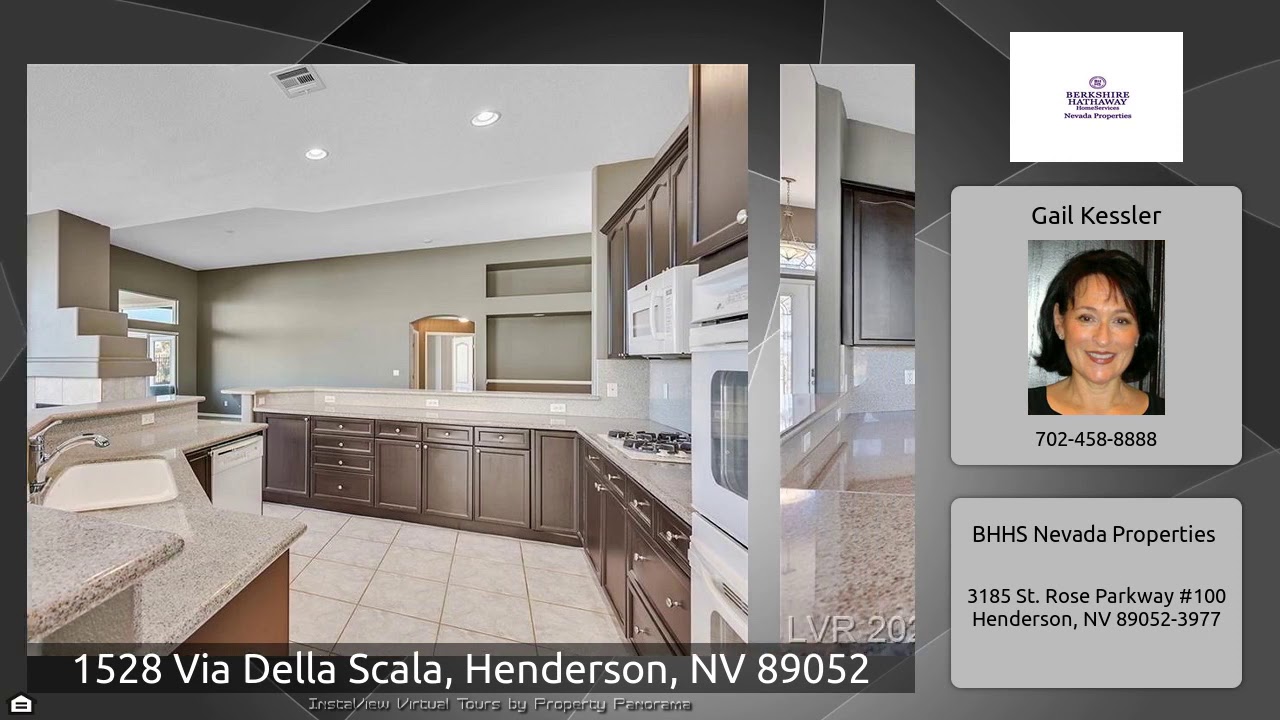 The Virtual Tour for the property at 1528 Via Della Scala, Henderson, NV 89052 listed for $625,000: Other homes for sale by Gail Kessler of BHHS Nevada Properties: Entertainers Dream.Elevated Seven Hills One Story Almost 3200 Sq Ft !Great Mountain Views ! Near Raiders Headquarters,Inground Spa W Waterfall!Super Open Floorplan.Stone Front W Steps,Double Leaded Front Door Entry.Kitchen W Two Breakfast Bars,Granite Counters,Double Ovens,Micro,Nook,2 Pantrys.Oversized Family Room.Formal Open Dining Room.Large Master W Sitting Area,Large Secondary Bedroom ,W/ Bathroom.French Doors,Fans,Pleated …
