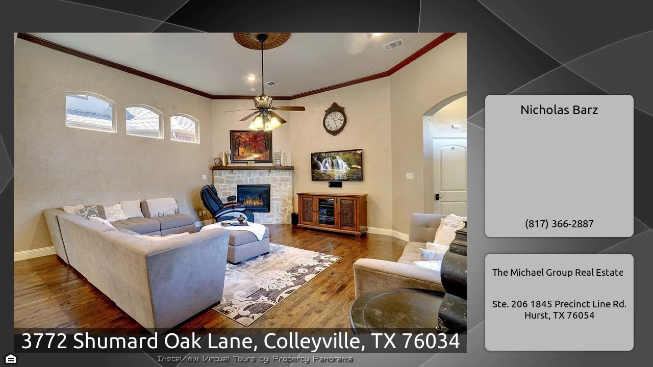 The Virtual Tour for the property at 3772 Shumard Oak Lane, Colleyville, TX 76034 listed for $3,500: Other homes for sale by Nicholas Barz of The Michael Group Real Estate: For Sale@$625,000, walk to all 3 Heritage schools. Plantation shutters, tinted windows, flat screen & surround sound wiring & granite counters thru out, low utilities, hardwoods 1st floor, 2 masters, welcoming entry with art niche, spiral iron staircase, Study, Dining & butler pantry. Spacious completely open kitchen & living with privacy windows & french doors to flagstone patio. Eatin kitchen with georgeous granite, …