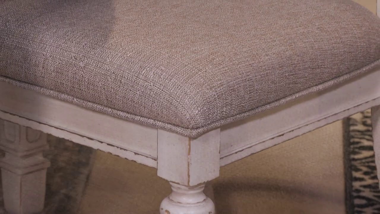 French twist. With its stylized ribbon back, chipped white finish and plushly cushioned seat, the Realyn dining room chair has all the right ingredients for a French country-inspired feast for the eyes.