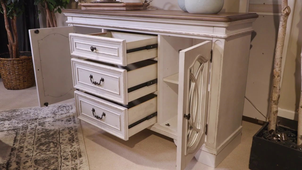 Serve up a French country-inspired feast for the eyes with the Realyn dining room server. Unique elements include cabinet storage beautified with decorative fretwork over mirrored glass and a doubly charming two-tone aesthetic pairing a chipped white with a distressed wood finished top.