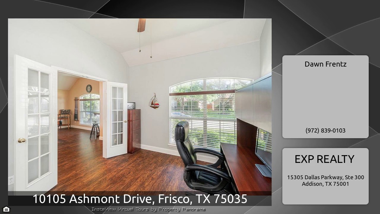 The Virtual Tour for the property at 10105 Ashmont Drive, Frisco, TX 75035 listed for $349,000: Other homes for sale by Dawn Frentz of EXP REALTY: Fall in love with this beauty in popular Hillcrest Estates! Home sits on interior, north facing, beautifully landscaped lot with GORGEOUS backyard, featuring stunning, covered, cedar porch, hot tub and 8 ft cedar bb privacy fence. Inside are split bedrooms, 2 bedrooms with full bath on one side and master suite and bathroom on the other. Stacked formal living and dining and study with french doors, easily converted in to a 4th bedroom with …
