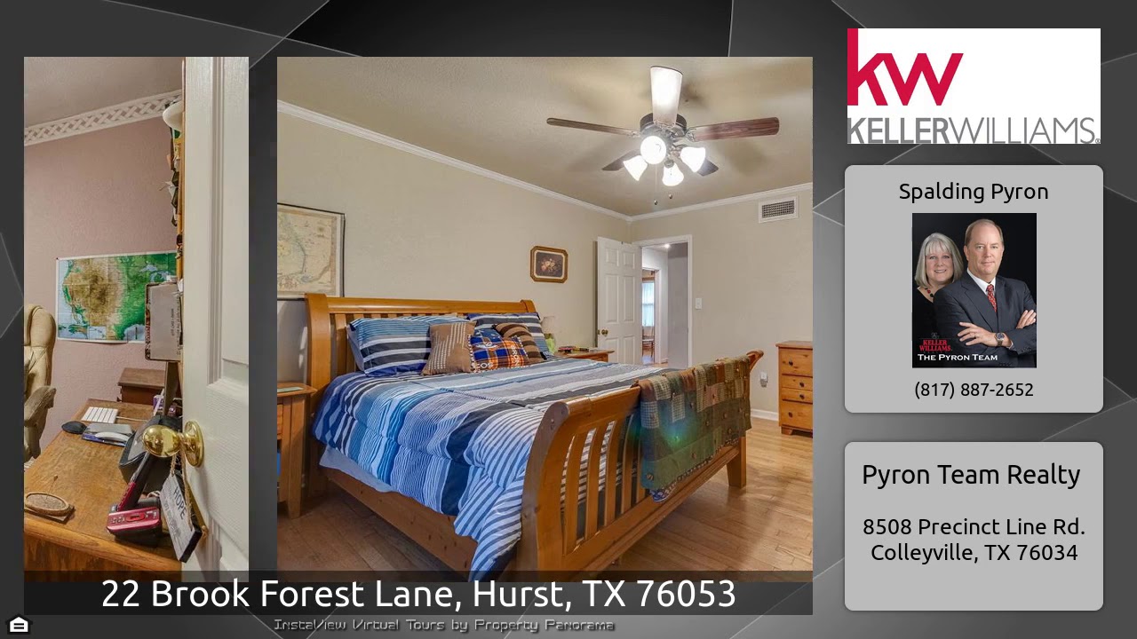 The Virtual Tour for the property at 22 Brook Forest Lane, Hurst, TX 76053 listed for $289,000: Other homes for sale by Spalding Pyron of Pyron Team Realty: Amazing property nestled on over a half acre cul-de-sac lot offers 3 spacious bedrooms, 2 full baths, large kitchen with SS appliances, breakfast bar and a cozy breakfast nook, inviting formal dining with sitting area, french doors lead off of the dining into the family room & private office, master suite features a pedestal sink & separate shower along with retro tile. Beautiful hardwoods in living and bedrooms. Your private & serene …