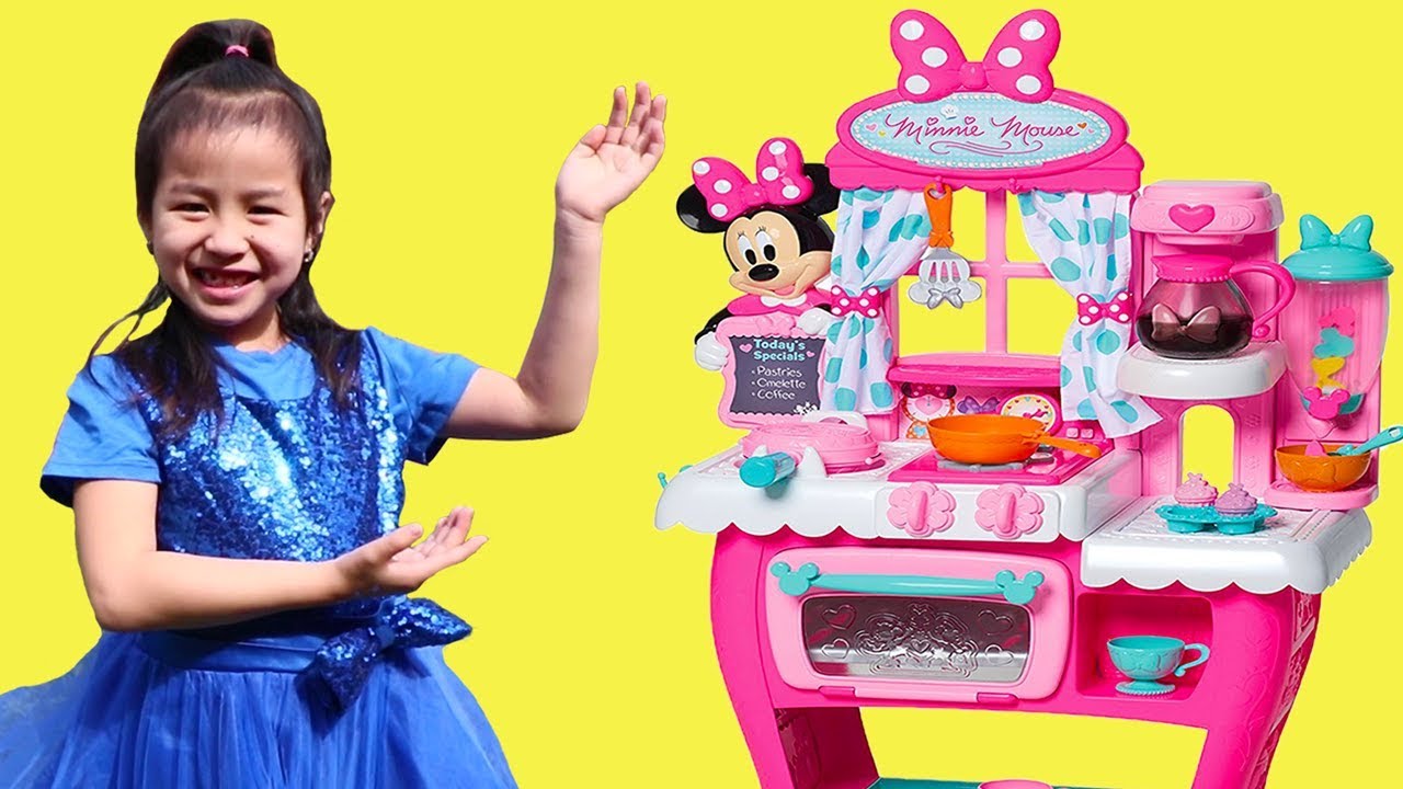 Jannie pretend plays with a big Minnie Mouse kitchen playset toy. She plays with a Minnie Mouse plush doll and pretends to drink tea. Auntie comes and they clean up together. After that, they use the toy to make a restaurant. Jannie makes food such as waffles, cereal, and coffee with the toys. Uncle surprises Jannie by getting her a diner playset. The diner has a kitchen and a place to eat in the front. She makes for food toys for them to play with such as hamburger and French fries!