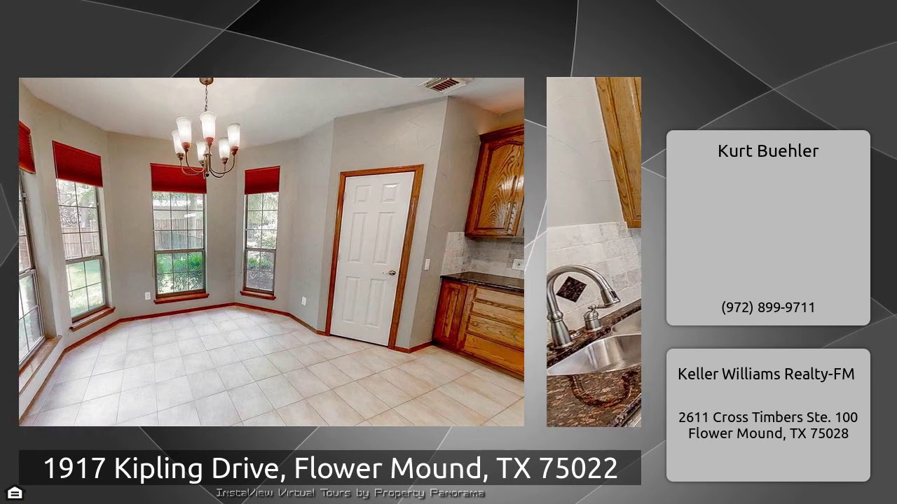 The Virtual Tour for the property at 1917 Kipling Drive, Flower Mound, TX 75022 listed for $489,500: Other homes for sale by Kurt Buehler of Keller Williams Realty-FM: Beautifully well maintained custom two story home on gorgeous green creek lot in desirable Walden Creek Estates! Home opens to front office with french doors that flows into dining room and living room! Gourmet kitchen features granite countertops, walk in pantry, large island, and breakfast room overlooking large living room with brick gas fireplace! Master suite downstairs with tub, separate shower, sitting area, and walk …