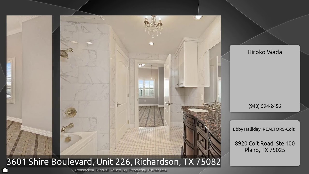 The Virtual Tour for the property at 3601 Shire Boulevard, Unit 226, Richardson, TX 75082 listed for $1,430: Other homes for sale by Hiroko Wada of Ebby Halliday, REALTORS-Coit: Luxury living awaits you at The Shire! You will sense the feeling of a boutique hotel as you enter the lobby doors. Wonderful amenities and covered parking. This 1st floor unit offers the most square footage with 1 bedroom and a separate study, a spacious living and dining area, 2 full baths and a French balcony. A few of the beautiful finishes include hardwood flooring, gourmet kitchen with a stainless appliances …