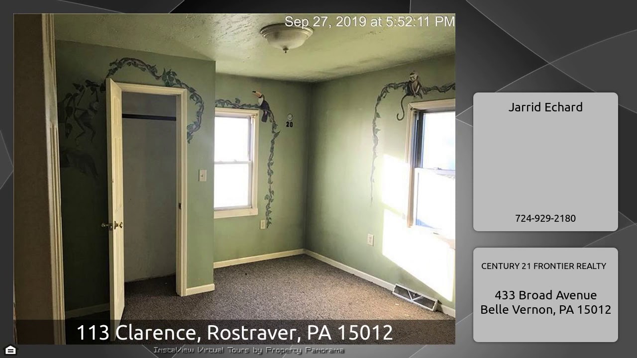 The Virtual Tour for the property at 113 Clarence, Rostraver, PA 15012 listed for $99,900: Other homes for sale by Jarrid Echard of CENTURY 21 FRONTIER REALTY: One level living on this 1.8 acre level lot, cozy 3 bedroom 2 bath full home in the Belle Vernon School District. Spacious kitchen with plenty of cabinet space, open living area, and over sized master bedroom. French doors off dining area lead to rear deck where you can enjoy the view of the enormous back yard. Lower Level Game room with walk out access to yard. Home is at end of dead end street off 201 and close to BV shopping, I-70, …