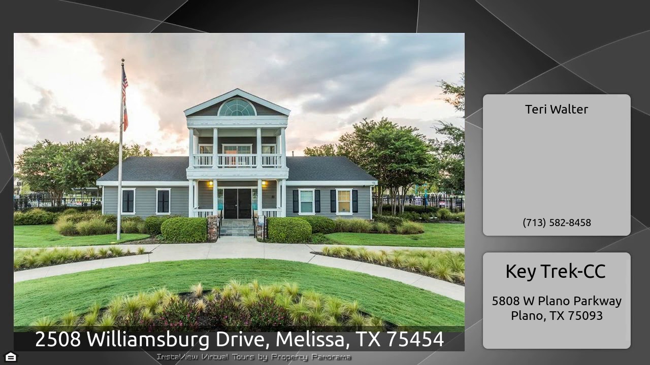 The Virtual Tour for the property at 2508 Williamsburg Drive, Melissa, TX 75454 listed for $368,900: Other homes for sale by Teri Walter of Key Trek-CC: Wonderful single-story, 3 car garage home in a great location. Sleek wood flooring are throughout the entry, dining, great room and kitchen. A private home office with French doors is located at the front of the home. The great room features a stunning corner fireplace. A welcoming kitchen hosts a gas cooktop, built in stainless steel appliances, and beautiful granite countertops. A large covered patio complete this well designed home. …