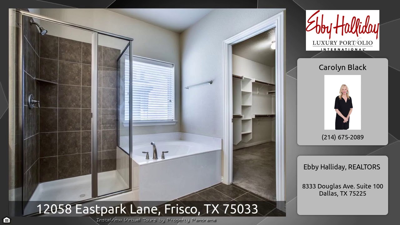 The Virtual Tour for the property at 12058 Eastpark Lane, Frisco, TX 75033 listed for $389,000: Other homes for sale by Carolyn Black of Ebby Halliday, REALTORS: Wonderful well maintained DR Horton home in desirable Griffin Parc development. Conveniently location just south of Eldorado Parkway. First floor master with large walk-in closet, separate shower and garden tub .Kitchen open to dining and living with views of the backyard. The kitchen features granite countertops, gas cooktop, stainless steel refrigerator, wall oven and microwave. A separate office or music room with french doors …