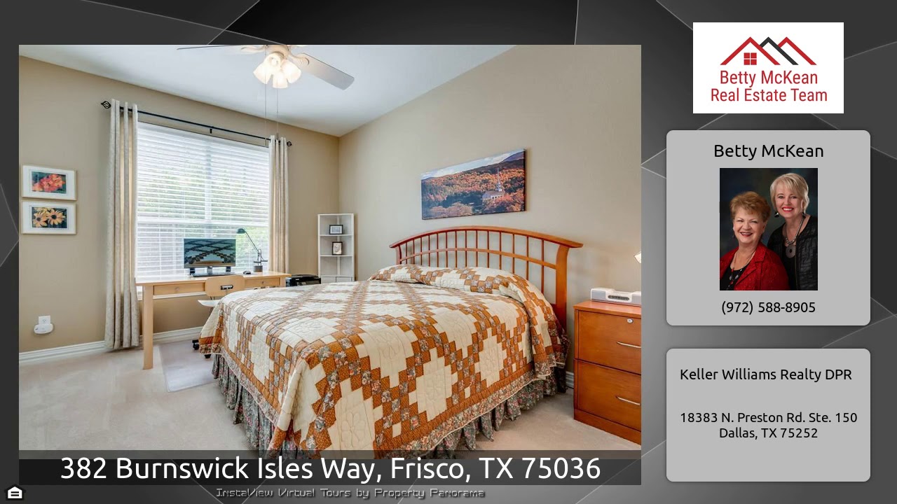 The Virtual Tour for the property at 382 Burnswick Isles Way, Frisco, TX 75036 listed for $414,000: Other homes for sale by Betty McKean of Keller Williams Realty DPR: PRIVATE OVERSIZED LOT! Concord floorplan features fabulous hardwoods, trey ceilings, coffered ceilings & crown molding everywhere. Oversized master retreat w most space you've ever seen, including bay window, & seating area & separate vanities in enSuite w garden tub & walk-in shower. Private guest bedroom adjacent to generous guest bath. Study w French doors & dramatic coffered ceiling. Formal dining room leads to gourmet …