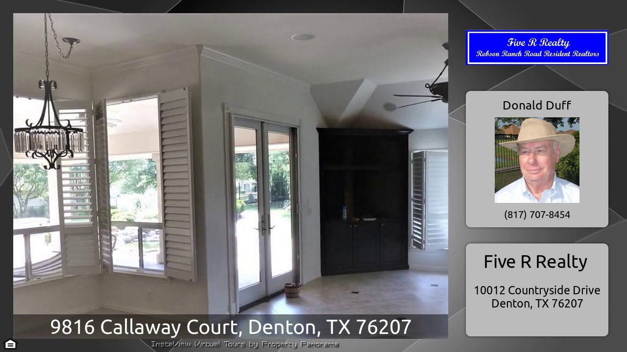 The Virtual Tour for the property at 9816 Callaway Court, Denton, TX 76207 listed for $457,500: Other homes for sale by Donald Duff of Five R Realty: Unique home on.4 acre.Landscaped front & back-walking path-mature oak trees-water feature-gas fire pit-outdoor granite countertop -bar- gas grill. Large covered patio. Plantation shutters-16” tile flr thruout.Family rm- French doors, FP-ceiling speakers-crown molding-ceiling fan. Bright kitchen-2 sunlight tubes-gas cooktop-dishwasher-microwave-oven-warming oven. Study-sunlight tube-crown molding. Dining rm-breakfast nook. Guest bedrm-Murphy …