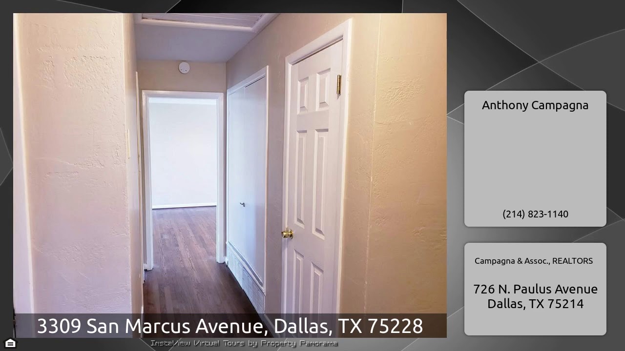 The Virtual Tour for the property at 3309 San Marcus Avenue, Dallas, TX 75228 listed for $1,495: Other homes for sale by Anthony Campagna of Campagna & Assoc., REALTORS: 3 bedroom 1 bath and one half bath brick Casa View home. Refinished hardwood floors. All new crown molding in Den, Living room, dining and kitchen. Tile in kitchen, bath and utility. Utility has full size washer and dryer connections. Fenced backyard, spacious patio. Big giant trees. New concrete driveway. Converted 1 car garage with 312 sq. added as a den with french doors, new aqua guard lam-anent floors. All new LED can …