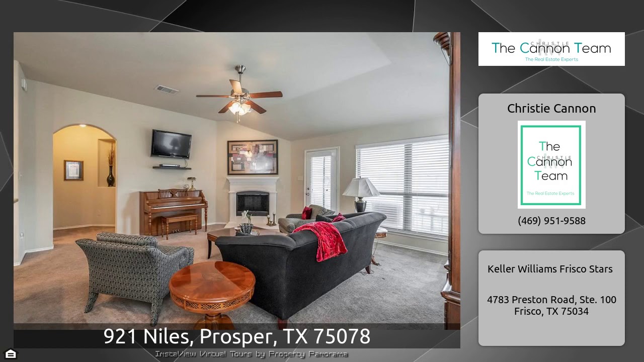 The Virtual Tour for the property at 921 Niles, Prosper, TX 75078 listed for $275,000: Other homes for sale by Christie Cannon of Keller Williams Frisco Stars: Prosper gem! Charming single story front garage with peaked roofline. Ceramic Tile entry to Formal dining spacious enough for your extended table and buffet! Pass through to kitchen makes for entertaining ease. Eat in kitchen with island and plenty of counter space! Abundant storage and open concept floorplan! Study can be used as 4th bedroom! Large living room highlighted by cast stone fireplace! Secluded Owner's Suite with french …