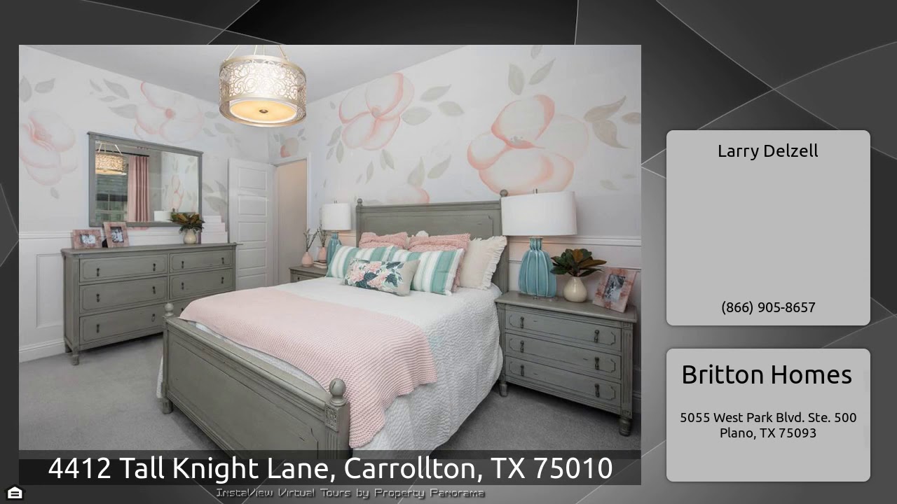 The Virtual Tour for the property at 4412 Tall Knight Lane, Carrollton, TX 75010 listed for $799,900: Other homes for sale by Larry Delzell of Britton Homes: BRITTON HOMES FORMER MODEL! Library with French doors off the two-story entry. Kitchen features 5-burner gas cooktop, double wall ovens, a large pantry and an island. Dining area leads to open family room with a wood mantel fireplace and three large windows. Master suite with three large windows. Double doors lead to master bath with dual vanities, garden tub, a separate glass enclosed shower and two large walk-in closets. Second floor …