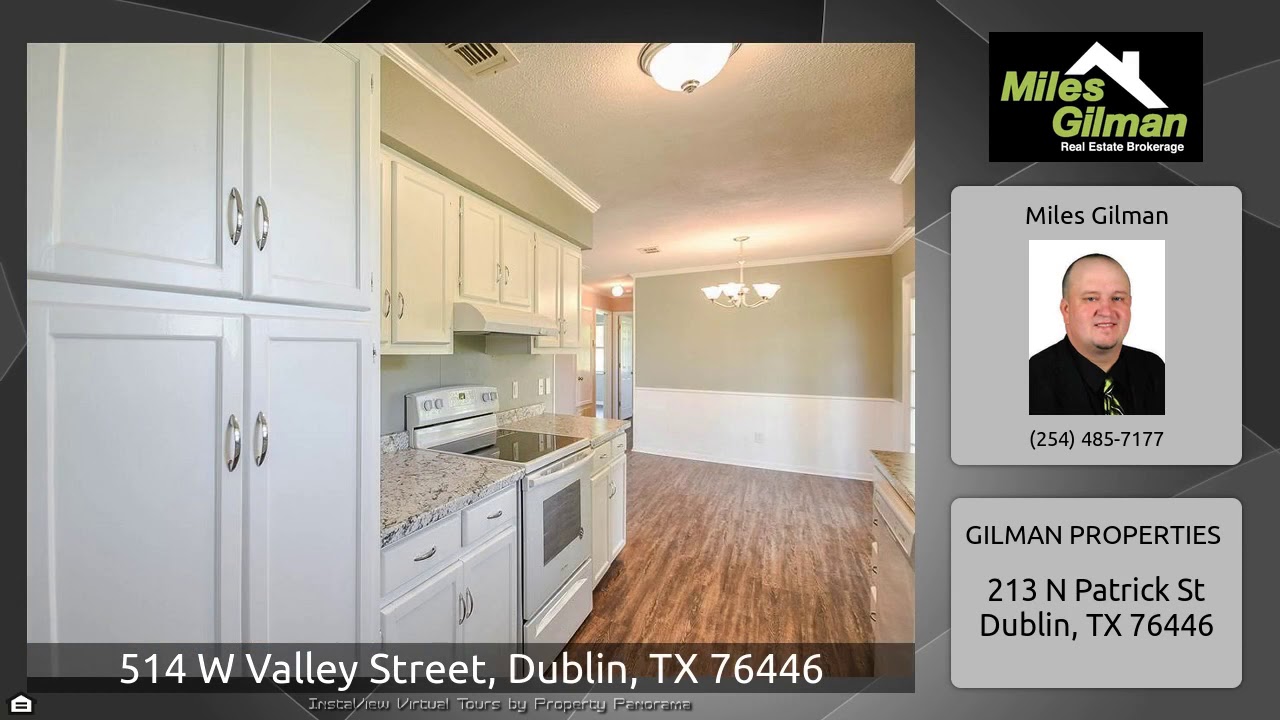 The Virtual Tour for the property at 514 W Valley Street, Dublin, TX 76446 listed for $157,000: Other homes for sale by Miles Gilman of GILMAN PROPERTIES: YES! This 3 bed, 2 bath charmer has just been remodeled! Large, open to dining living room shines natural light from the front of the house to the back. Dining room looks out into backyard through glass french doors and connects to all new galley style kitchen. New appliances sprinkled throughout it, ample cabinet storage, beautiful carpentry throughout kitchen which leads to walk through utility, into a recently added one car garage with …