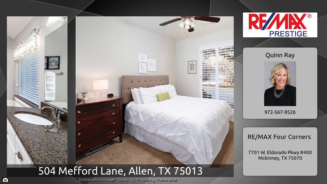 The Virtual Tour for the property at 504 Mefford Lane, Allen, TX 75013 listed for $497,000: Other homes for sale by Quinn Ray of RE/MAX Four Corners: Darling 4 bdrm, 3 bath craftsman home located in sought after Park at Montgomery Farm. The home features a private study w French doors, formal dining room, large game room w study nook, and a backyard you'll love! Gorgeous pool and spa, covered outdoor living area, and still plenty of grass for kids and pets to play! If that's not enough, the large covered front porch is a great place to visit with neighbors. This home also has beautiful …