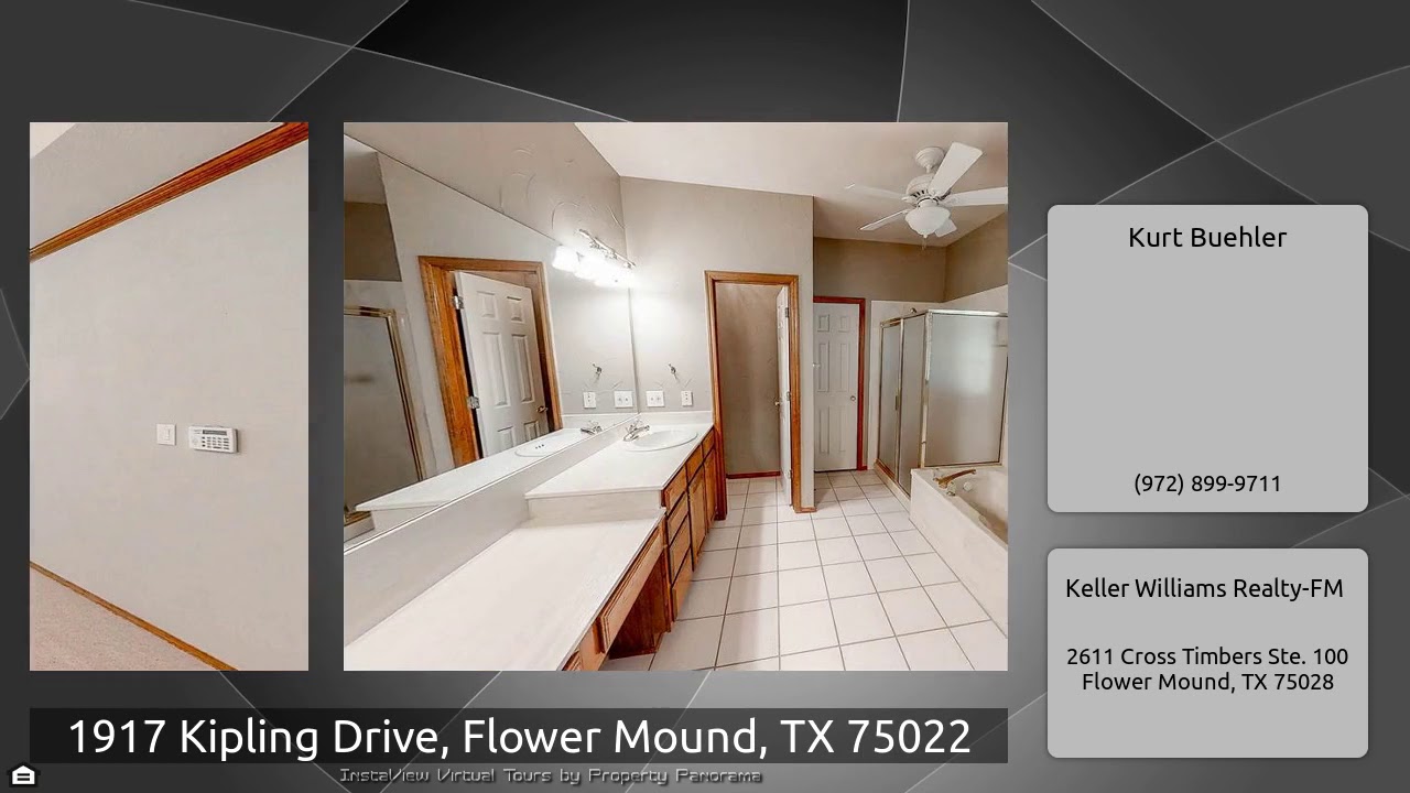 The Virtual Tour for the property at 1917 Kipling Drive, Flower Mound, TX 75022 listed for $489,500: Other homes for sale by Kurt Buehler of Keller Williams Realty-FM: Beautifully well maintained custom two story home on gorgeous green creek lot in desirable Walden Creek Estates! Home opens to front office with french doors that flows into dining room and living room! Gourmet kitchen features granite countertops, walk in pantry, large island, and breakfast room overlooking large living room with brick gas fireplace! Master suite downstairs with tub, separate shower, sitting area, and walk …