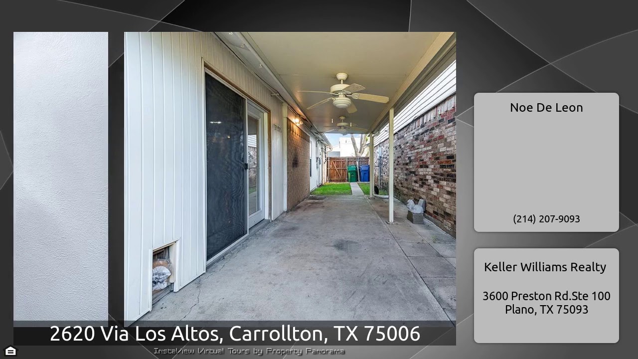 The Virtual Tour for the property at 2620 Via Los Altos, Carrollton, TX 75006 listed for $214,700: Other homes for sale by Noe De Leon of Keller Williams Realty: Move-In Ready! Immaculately Maintained Detached Townhome with an Abundance of sunlight & loaded with Storage. Nestled near County Place Elementary. Fresh Paint, Granite countertops, large Breakfast Bar & Buffet. Open living-dining area with French doors leading to a large covered patio with ceiling fans and Private Fenced Yard. Updates include Anderson Windows, Light Fixtures, Ceiling fans, Nest Thermostat & Doorbell & much more. …