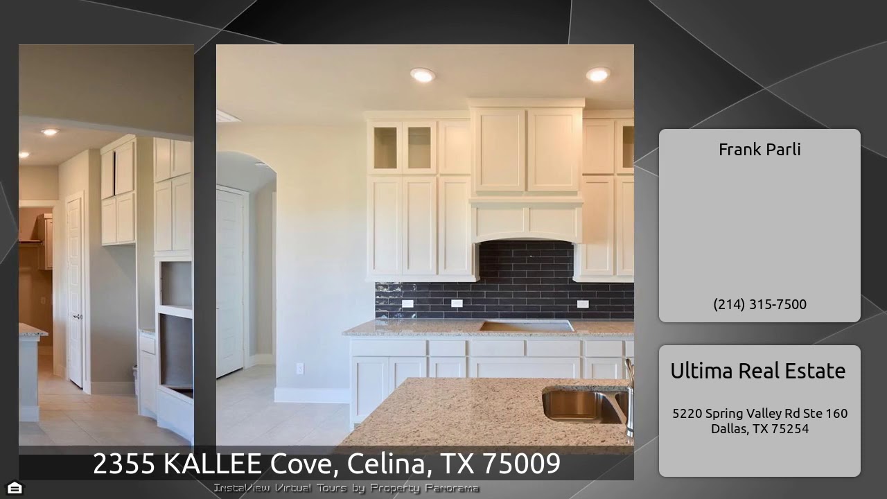 The Virtual Tour for the property at 2355 KALLEE Cove, Celina, TX 75009 listed for $439,000: Other homes for sale by Frank Parli of Ultima Real Estate: $50K PRICE DROP!Brand New ONE STORY on 1 acre in Celina! No city taxes! Beautiful brick and stone combination. Fantastic layout features HUGE Formal Dining with Panned ceiling, large Study with French Doors, HUGE Family Room with 12' ceiling, 20' x 14' Master Bedroom with 12' ceiling and HUGE closet, great Kitchen with Custom Cabinets and granite tops, 3 large bedrooms, and HUGE 18' x 18' Game Room! Hardwood floors in Entry, Study, F. …