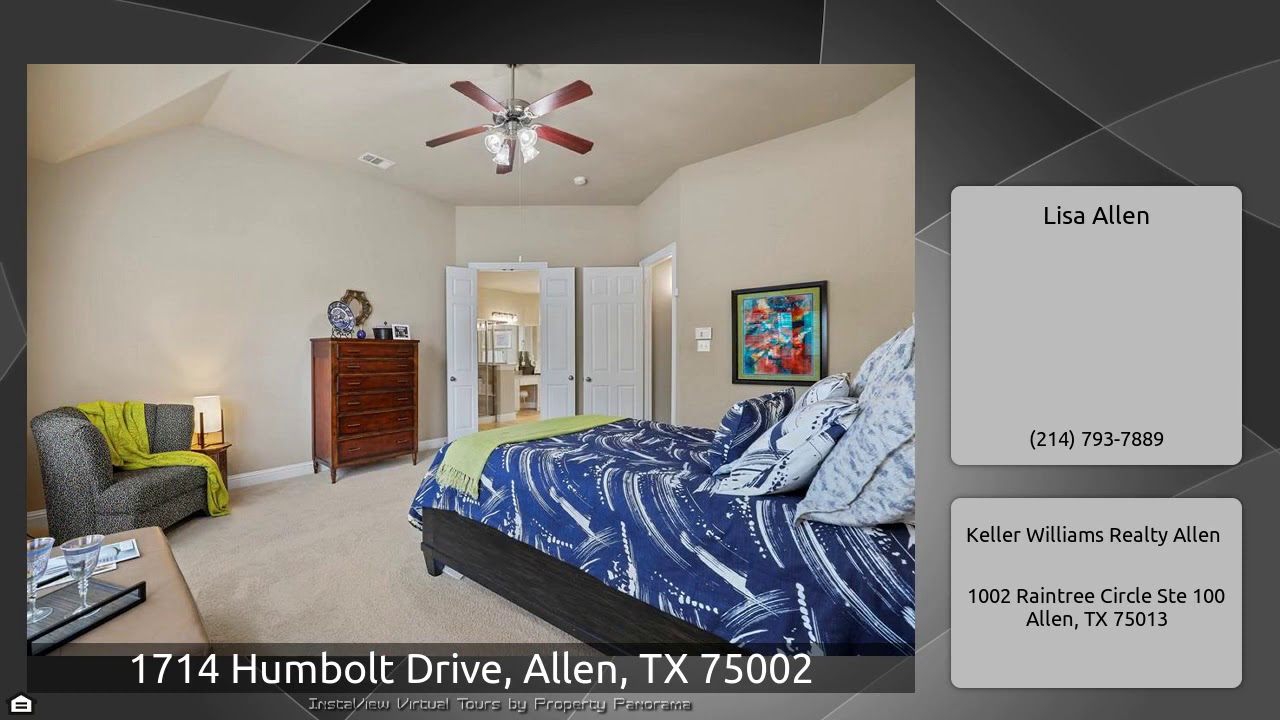 The Virtual Tour for the property at 1714 Humbolt Drive, Allen, TX 75002 listed for $384,900: Other homes for sale by Lisa Allen of Keller Williams Realty Allen: If you are looking for turn-key, this is the home for you! Perfectly maintained with upgrades galore! Upgraded granite, gas stove & new microwave in kitchen and beautiful engineered hardwoods in living room & formal dining room. Private office has crown molding & glass french doors. Master suite has huge closet with Container Store organization. Three split bedrooms on first floor & fourth upstairs with en suite bath and game room. …