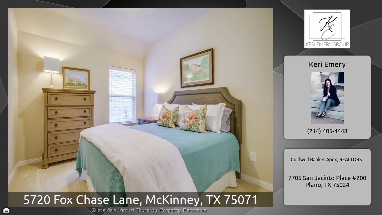The Virtual Tour for the property at 5720 Fox Chase Lane, McKinney, TX 75071 listed for $325,000: Other homes for sale by Keri Emery of Coldwell Banker Apex, REALTORS: Adorable, like new home perfectly situated on a greenbelt lot. Beautiful upgrades to include wood flooring in entry and main living areas, upgraded paint and designer light fixtures in kitchen. Open and bright kitchen with large center island and breakfast area. Three bedrooms, PLUS a study with French doors and separate formal dining. Custom features and updates include, gorgeous front door, extended covered stamped concrete …