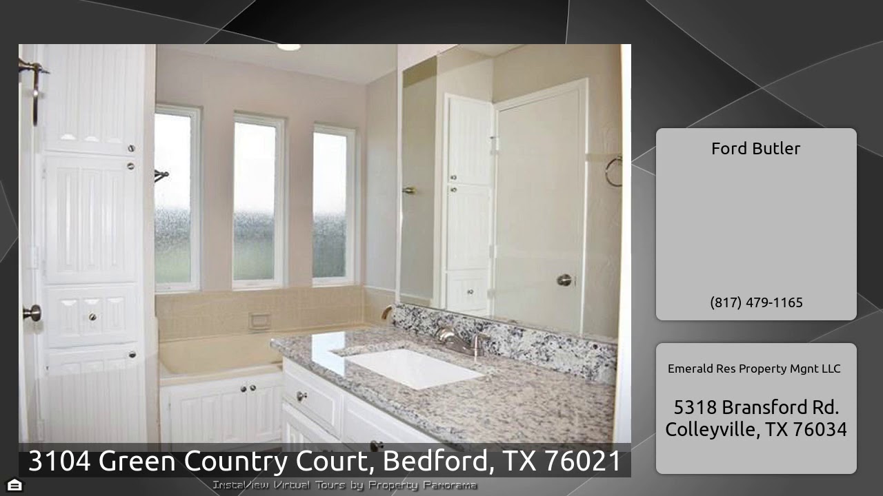 The Virtual Tour for the property at 3104 Green Country Court, Bedford, TX 76021 listed for $2,150: Other homes for sale by Ford Butler of Emerald Res Property Mgnt LLC: Beautifully remodeled 3-2-2 on cul-de-sac in Bedford, HEB ISD! New flooring, carpet, granite, ductwork, paint, fixtures & so much more! Spacious living has luxury plank flooring, tray ceilings, wainscoting & lovely bow windows. Second living offers French doors to the well-landscaped backyard. Bright kitchen boasts an elegant dining room, custom cabinets, gorgeous granite counters & a refrigerator included! Huge 19×14 …