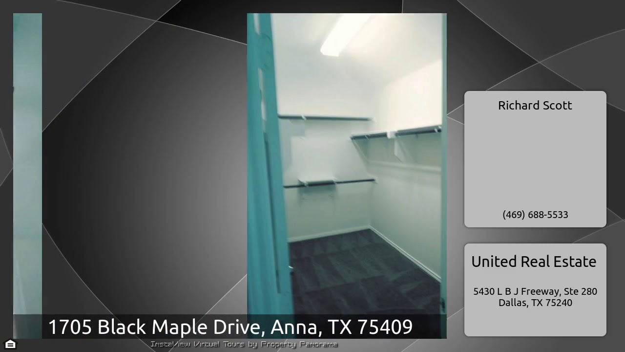 The Virtual Tour for the property at 1705 Black Maple Drive, Anna, TX 75409 listed for $1,600: Other homes for sale by Richard Scott of United Real Estate: Like new Covered backyard patio with ceiling fan. Fenced backyard. Kitchen opens to main living room and has a breakfast area. Also has formal dining room plus a den with French doors. Wood burning fireplace has tile surround. HOA paid by landlord has community pool.