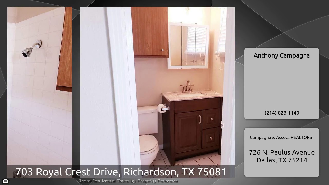 The Virtual Tour for the property at 703 Royal Crest Drive, Richardson, TX 75081 listed for $1,395: Other homes for sale by Anthony Campagna of Campagna & Assoc., REALTORS: 2 Bedroom, 2 Bath duplex with private courtyard in Richardson. Pergo Laminate Wood floors in bedrooms & Living Room; ceramic tile in kitchen, Dining Room, Utility Room & Baths. Master bedroom has French doors which lead to fenced in back yard. Appliances include: SS Ref., elec stove, DW, DISP & MW. Central HVAC and full size WD Connections.1 Covered carport. $500 pet deposit for a dog, $300 pet deposit for a cat. Tenant …