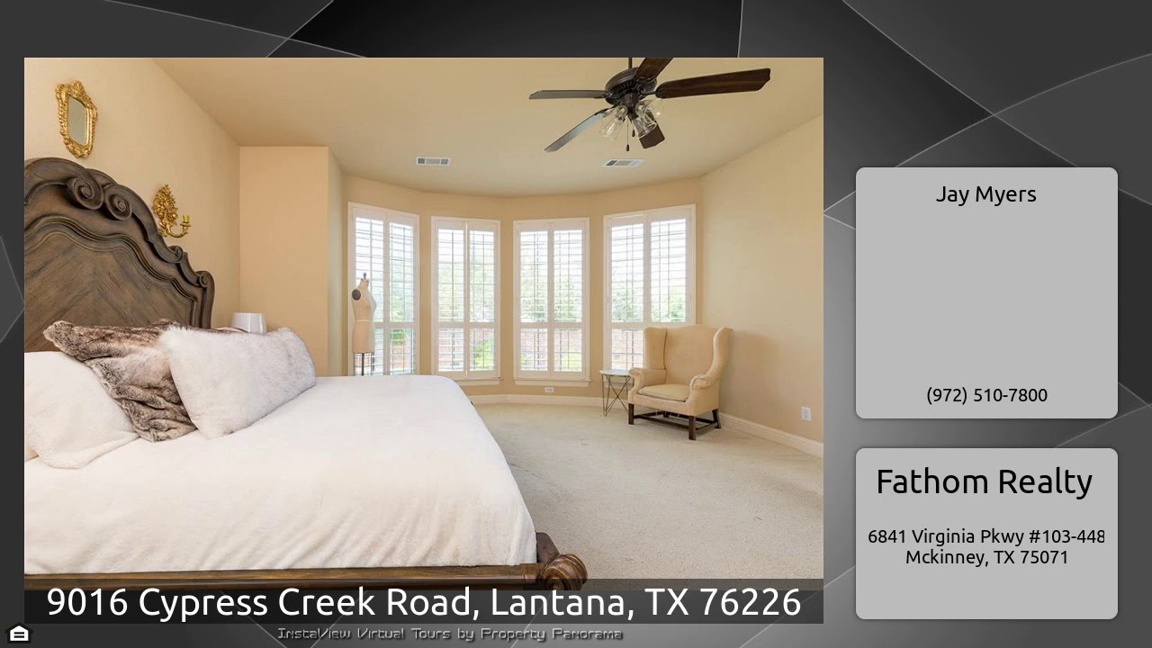 The Virtual Tour for the property at 9016 Cypress Creek Road, Lantana, TX 76226 listed for $375,000: Other homes for sale by Jay Myers of Fathom Realty: Awesome Lantana 4 Bedroom Open floor plan 3 Bedrooms 2 full baths down 1 up with game room & full bath. Formal study with glass french doors foyer & dining with hand-scraped hardwood lead to a light and bright island kitchen with seating double oven and glass door cabinetry and more room for breakfast dining Hand-scraped hardwood floors & stone fireplace finish out the family room Huge master suite with bay windows Plantation shutters …