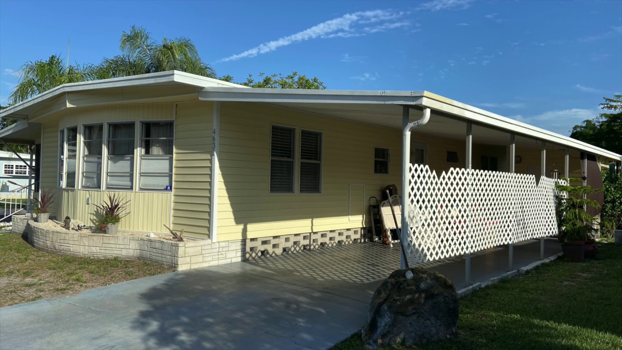 There is a side set screened/vinyl lanai off the living room with a concrete floor and wall a/c. GREAT for enjoying the Florida weather and watching the world go by!