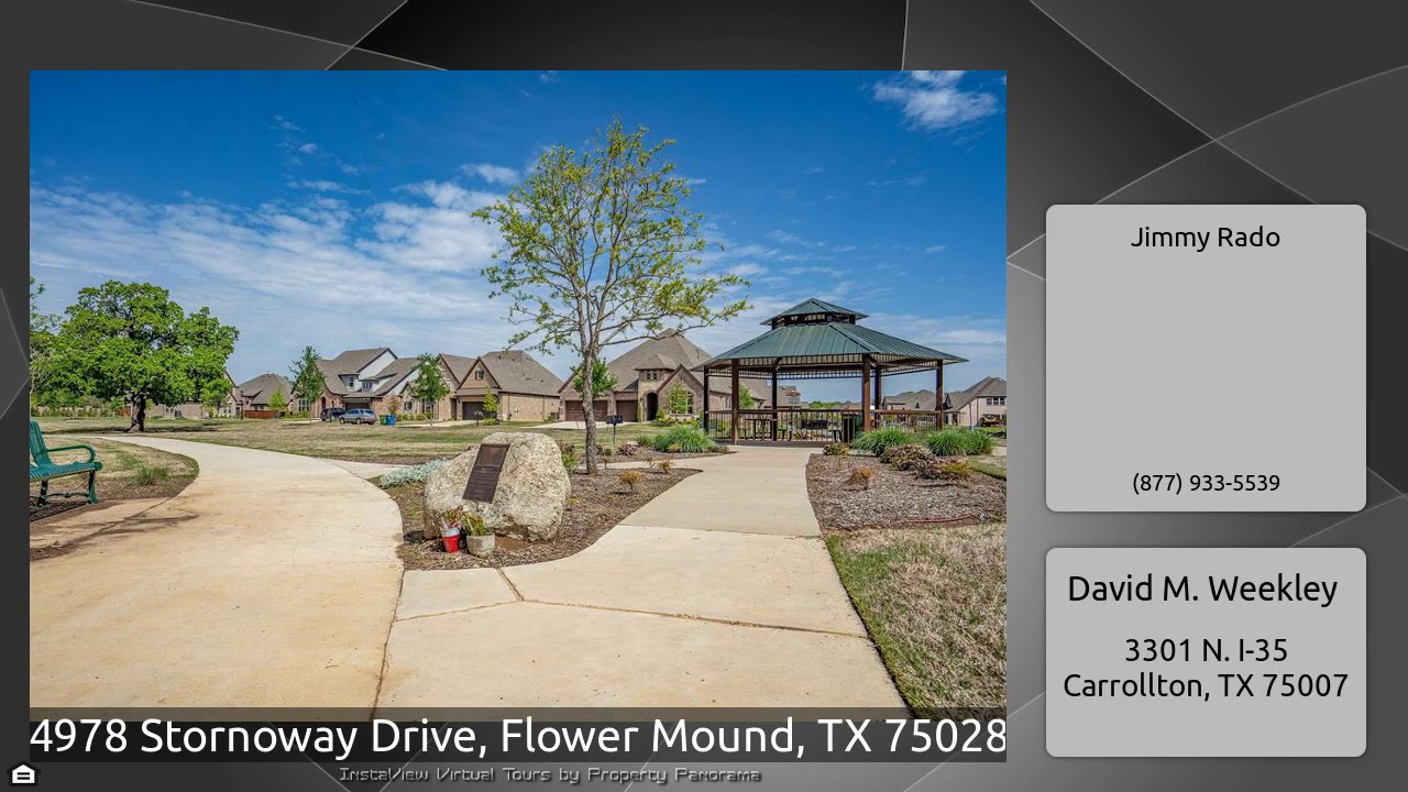 The Virtual Tour for the property at 4978 Stornoway Drive, Flower Mound, TX 75028 listed for $605,652: Other homes for sale by Jimmy Rado of David M. Weekley: NEW DAVID WEEKLEY HOME! Our popular Westgate Floor Plan. First floor features a spacious open concept with high family room ceilings adjacent to kitchen and dining. The formal private study has French doors. The owner's retreat offers a sitting area with bay window, and over sized bath and closet. Enjoy large secondary bedrooms, game, and media with double doors. Highly sought after Lewisville ISD in Flower Mound, with great access to …