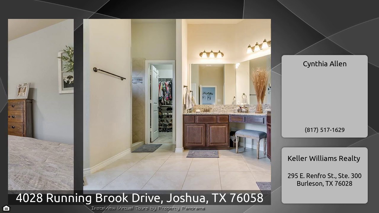 The Virtual Tour for the property at 4028 Running Brook Drive, Joshua, TX 76058 listed for $424,900: Other homes for sale by Cynthia Allen of Keller Williams Realty: STOP THE CAR! All the Beauty, Charm and Space you need in sought after Joshua Meadows! One-Owner Sandlin Home with so Many Upgrades! 3 Bedroom & 2.5 Bath Downstairs, Game Room, or Additional Living Area with add'l Full Bathroom Upstairs. French Doors to Impressive Study with Custom Built-In's, Formal Dining Area, Wood Flooring Throughout Home, Master Bedroom with Bay Window, Kitchen has Spacious Island, Scads of Cabinets. …